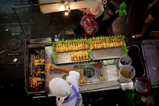 High angle view of man cooking squid at market stall