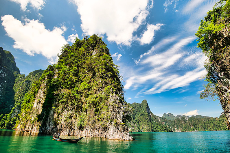 Let’s head to Cheow Lan Lake or, as it is also known, Rajjaprabha Dam in the gigantic Khao Sok National Park in Surat Thani Province.