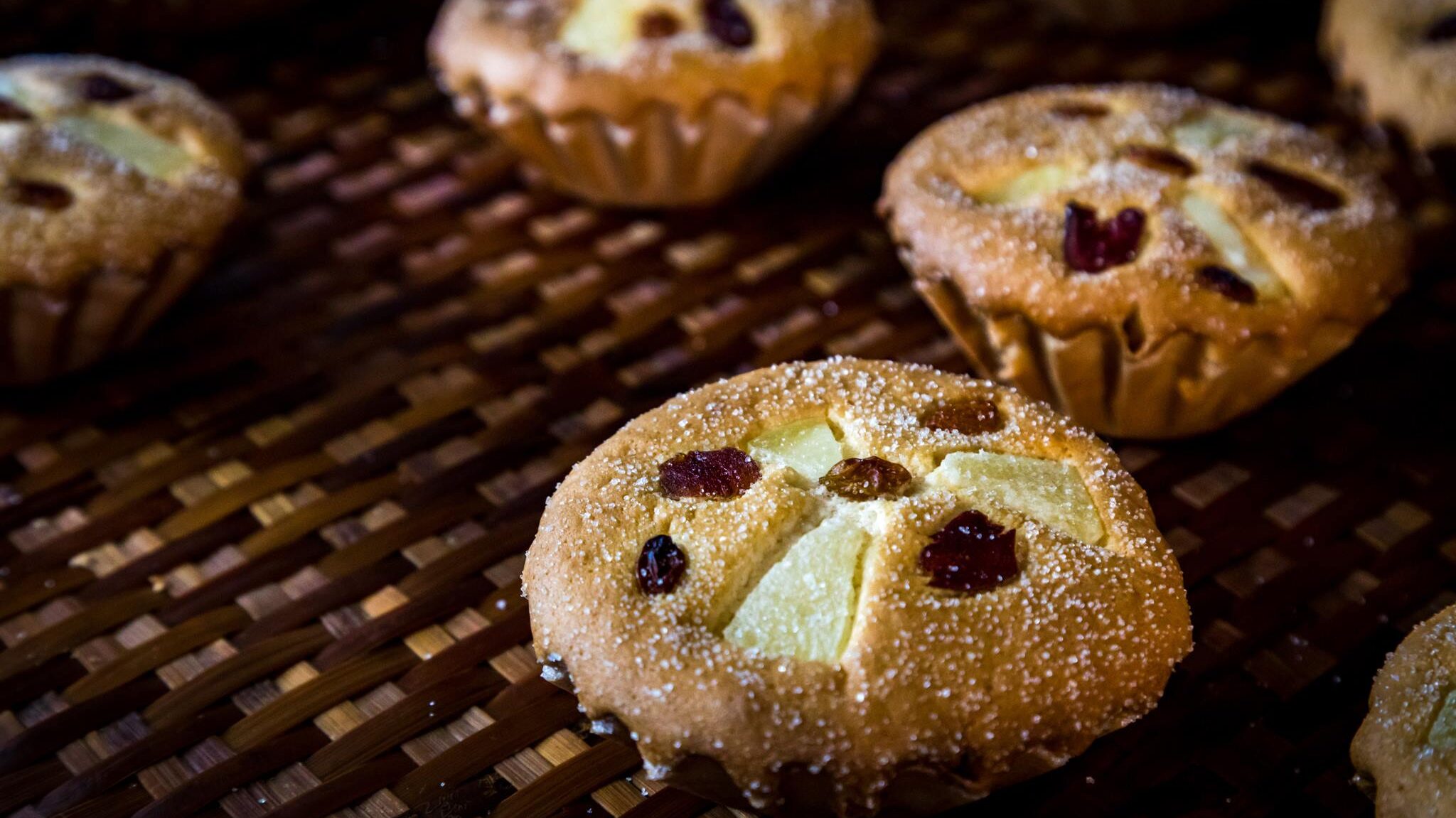 Sample Kudeejeen cupcakes: The recipe for these Portuguese-Chinese cupcakes has been passed down for five generations. The batter, made from duck eggs, white sugar, and wheat flour, is poured into metal cups, topped with dried winter melons, dried persimmons, or raisins, and cooked in wood-fired ovens until golden brown on the exterior and soft and fluffy on the inside.