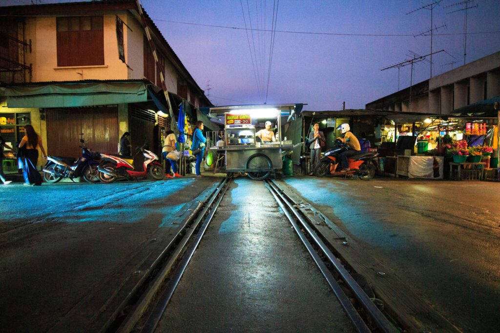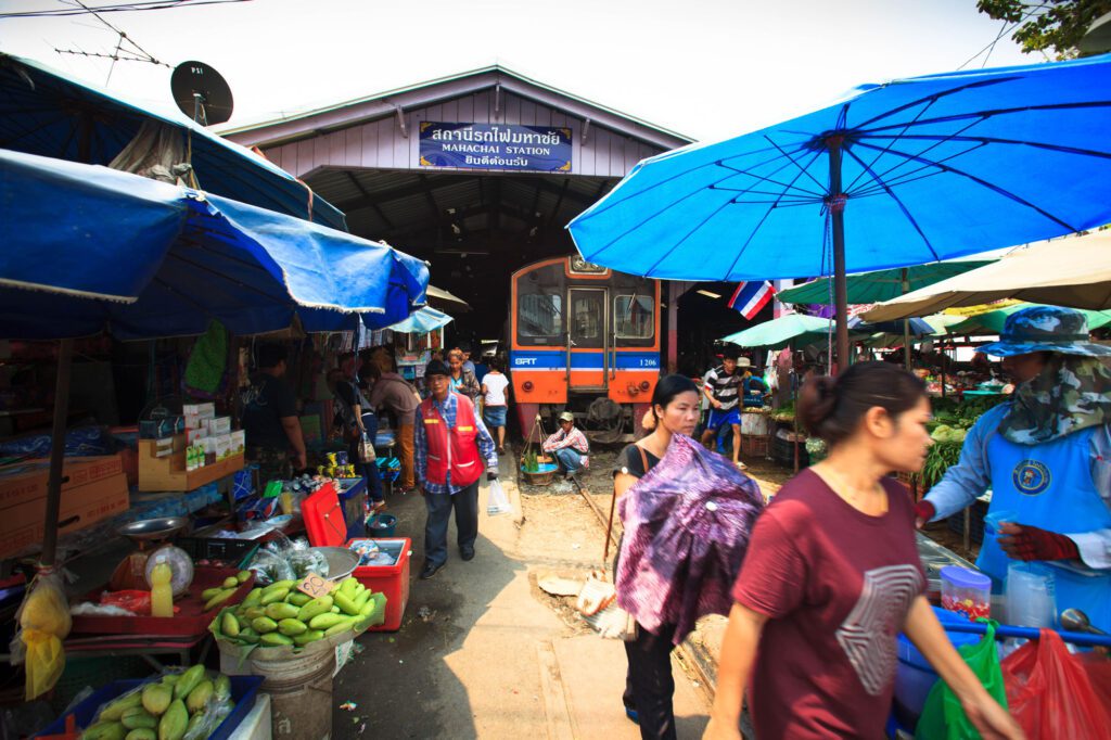 The journey begins with a train ride from Wongwian Yai (on the Thon Buri side of Bangkok) toward Mahachai, a town where the railway remains deeply woven into everyday life. Even today, Mahachai Station hosts a bustling market layered directly onto the tracks, echoing scenes found later along the route.