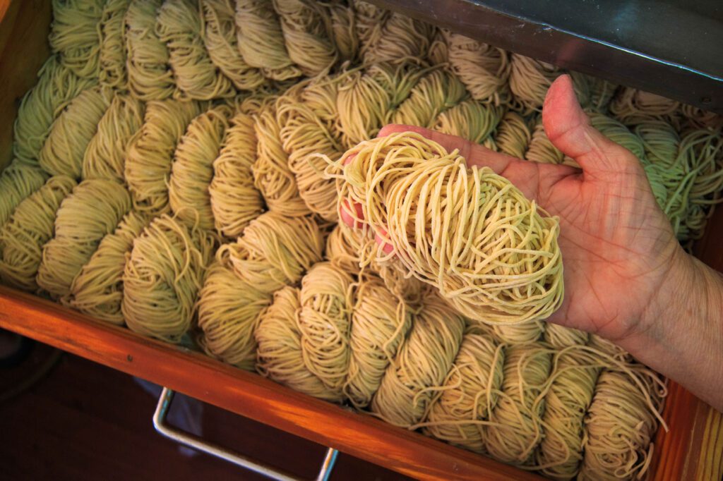 Beyond the market, Maeklong’s food culture reveals layers of local history. A long-established noodle shop is known among locals for its handmade dry egg noodles. After the noodles are freshly made, they are stored in drawers to preserve their texture and limit exposure to air—a method that gave rise to the nickname “drawer noodles.”