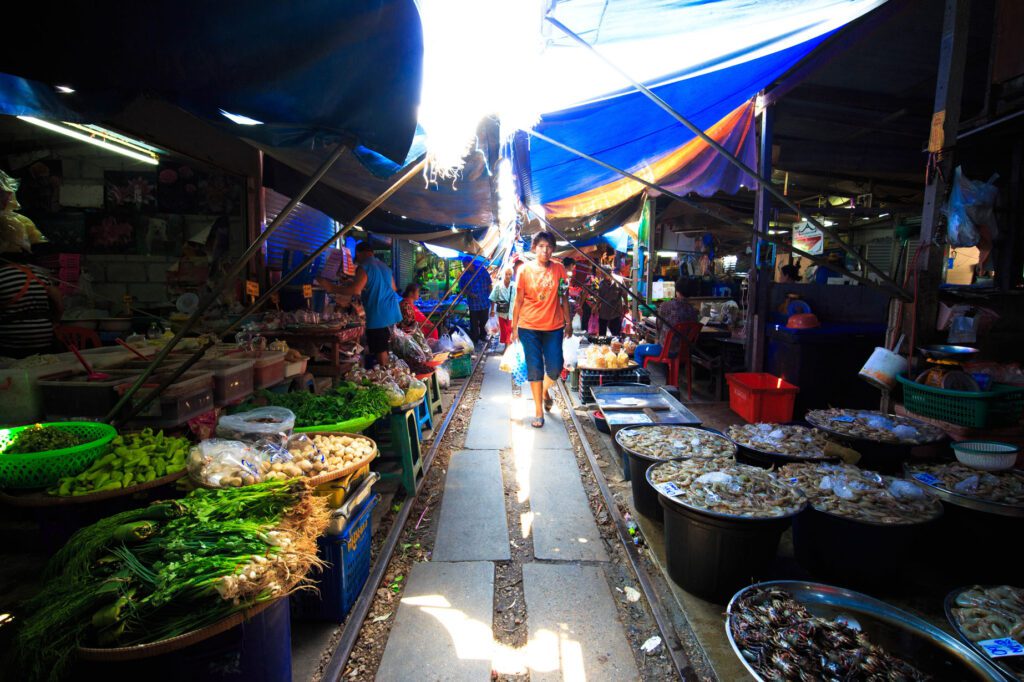 Arriving at Maeklong, the railway delivers travelers straight into the heart of one of Thailand’s most recognizable scenes. The Maeklong Railway Market stretches tightly along the tracks, where vendors swiftly fold back their awnings as the train passes through. While often described as unusual, the market is first and foremost a working local market, filled with seafood, produce, and goods from nearby orchards.