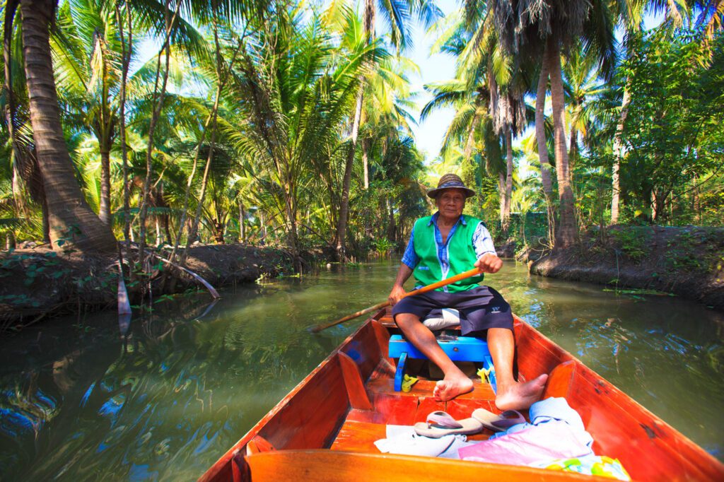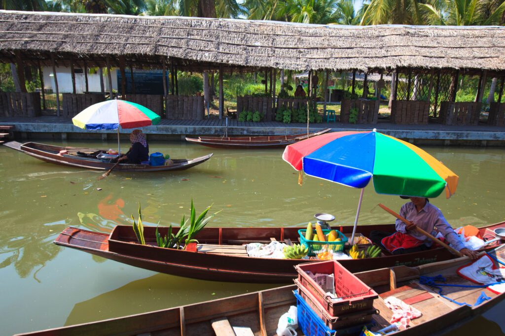 Another traditional market is Tha Kha Floating Market, where villagers still paddle boats filled with produce from their gardens to sell and exchange. A boat ride through the surrounding orchards reveals a network of narrow canals dug to irrigate fruit trees and support water-based travel.