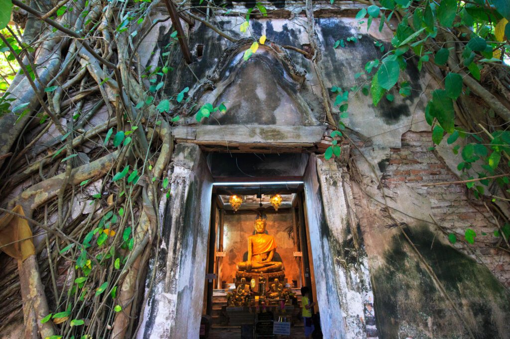 Boat trips from Amphawa often explore nearby waterways, including a visit to Bang Kung Temple, where a centuries-old chapel is almost completely enveloped by the roots and branches of surrounding trees.