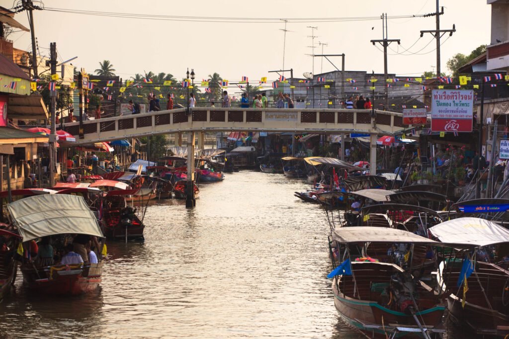 For travelers seeking a more traditional atmosphere, nearby floating markets provide alternatives. Bang Nok Khwaekretains a strong sense of local life and is especially known for Pad Thai made with large freshwater prawns from the Maeklong River.