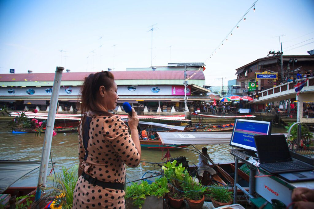 The songthaew passes directly through Amphawa Floating Market.