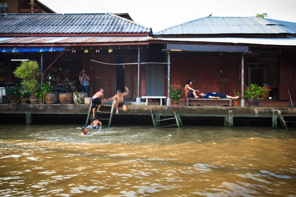 From Mahachai, a short ferry ride crosses the Tha Chin River to Tha Chalom, an old fishing village with a quieter, more nostalgic atmosphere. Wooden houses line the waterfront, and daily life moves at a gentler pace. Though many travelers pass through simply to catch the next train, Tha Chalom rewards those who linger.