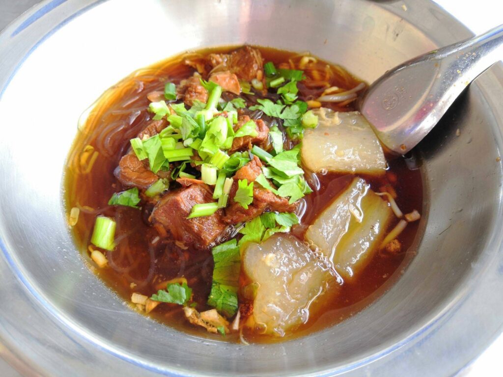 This unique noodle dish is made from a mellow red soup, a combination of local soy sauce, fresh palm sugar, spices, beef broth, and an amazing simmering Karen chili sauce from the Nong Ya Plong District. It has a fiery taste and aroma that are characteristic of the area. If you’re not sure how to order noodles in Thailand, here are three simple steps: First, decide if you prefer large noodles, thin noodles, rice noodles, or egg noodles. Then select the type of meat. The server often serves options like beef or pork, stewed beef, fresh meat, meatballs, and offal in the same bowl. Let the server know if you don’t eat anything, and then choose whether you would like your noodles to come with or without soup. Most noodles are served with boiled bean sprouts and a sprinkle of parsley and celery on top to enhance the savory flavor.