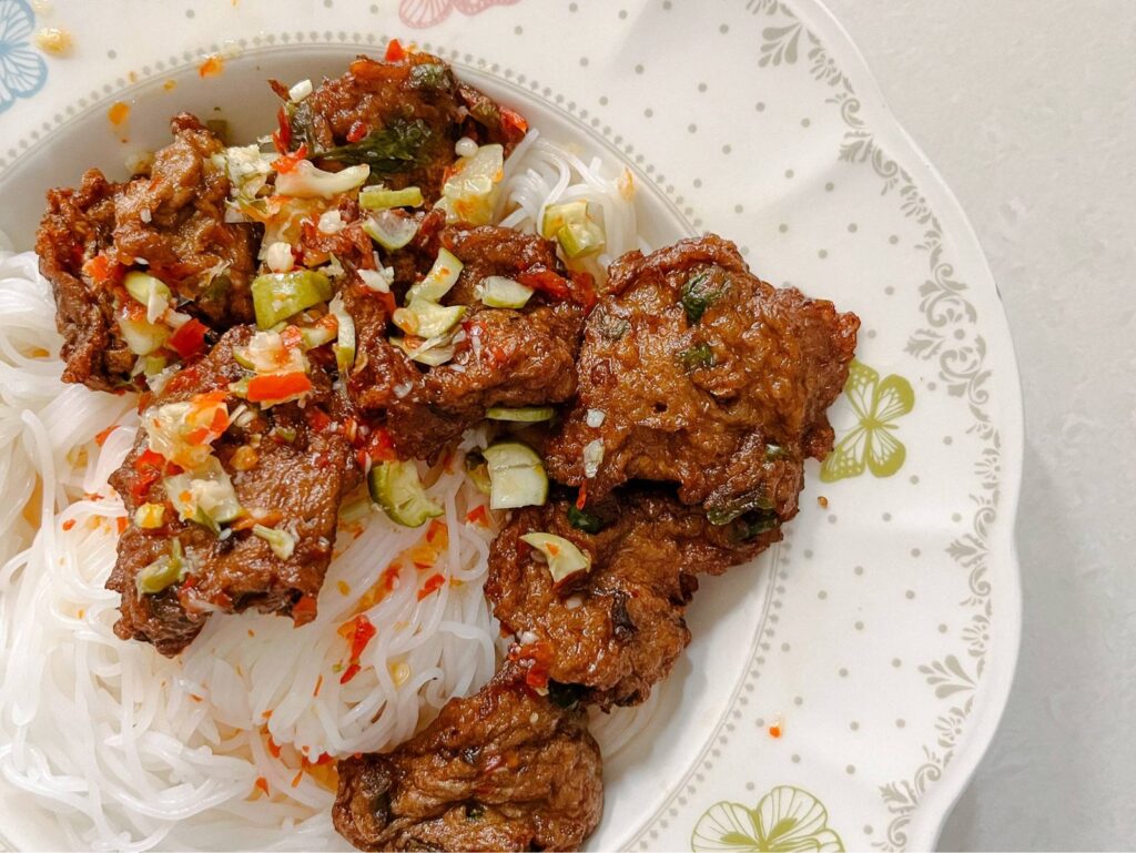 Non-locals might find this combo incompatible. However, the secret lies in the popular fried fish cake, which starts with fresh mackerel from the area, finely scraped, and then whisked with eggs, curry paste, chopped long beans, chopped kaffir lime leaves, and spices. Stir the mixture until it turns sticky. Then, flatten the mixture into bite-sized pieces and fry it in oil until golden brown. Arrange the rice noodles on the bottom, place the fried fish cake on top, and serve with Ajad, a Muslim-influenced dipping sauce consisting of sugar, vinegar, sliced cucumber, peanuts, and coriander leaves. As a side dish, the sweet and sour flavors pair wonderfully with the crisp texture of fried basil leaves.