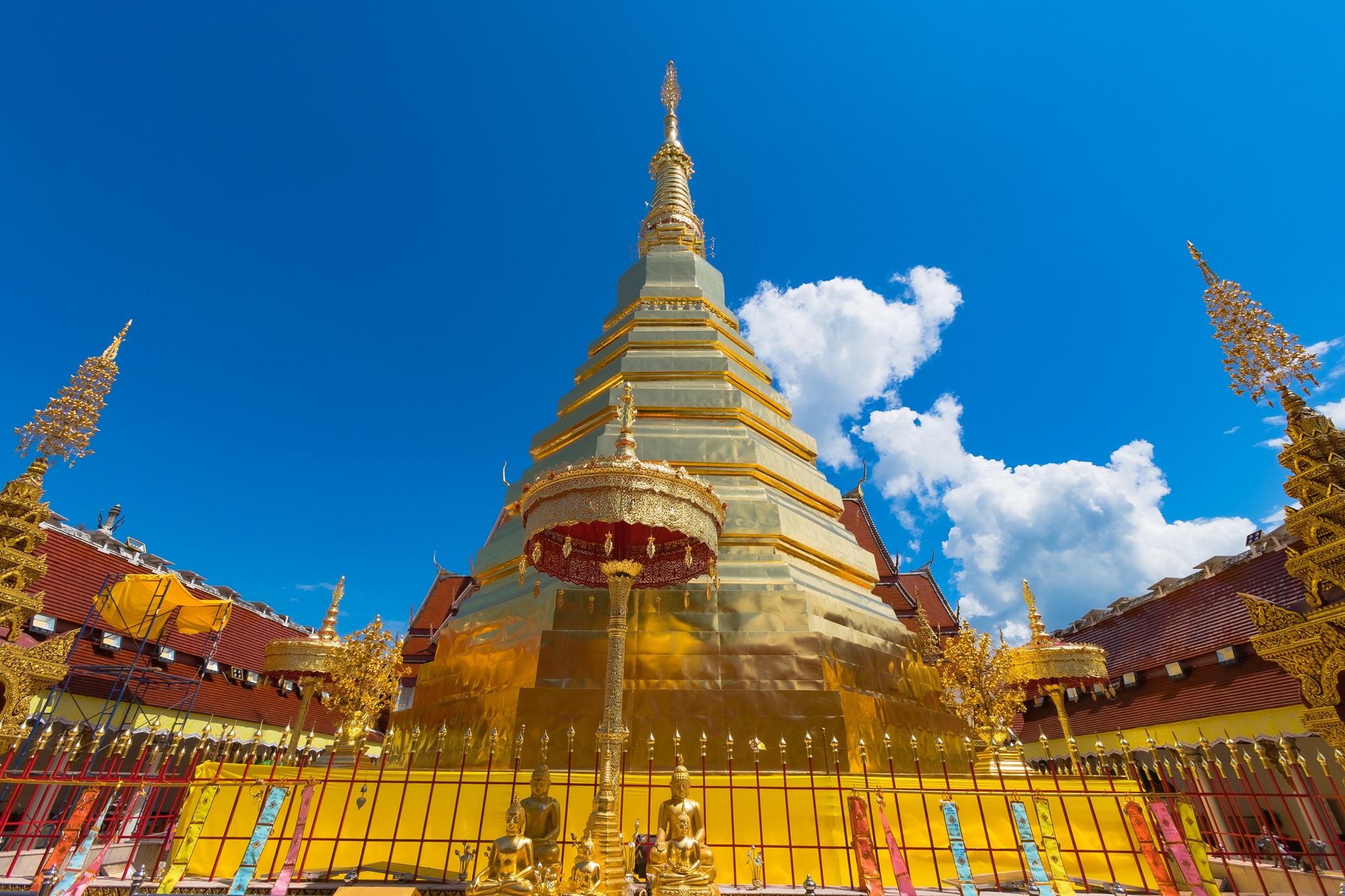 However, the two temples with the possibly most striking looks you find in the beautiful mountains above Phrae. Quirky Golden Rock temple has a collection of golden buildings, objects, statues and an enormous golden rock scattered out on a mountain side. The views over the valley I share with the Buddha-figurines makes the effort to walk up here worthwhile.