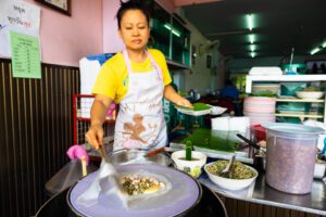 Famous for delicate steamed rice crêpes on Preeda Road, right in the city center.