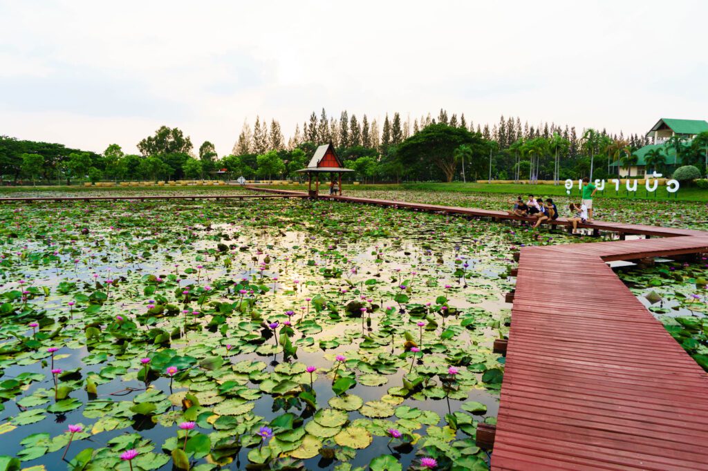 The city sits beside Nong Han, one of the most important wetlands in Northeastern Thailand. This vast freshwater basin has sustained communities for centuries and remains an ecological treasure filled with life—fish, birds, water plants, and seasonal blooms. A gentle way to encounter this landscape is the Chaloem Phra Kiat Lotus Park, built along the edge of the wetland and filled with lotus species of many colours. Walking the boardwalks here at sunrise feels like moving through a floating garden.