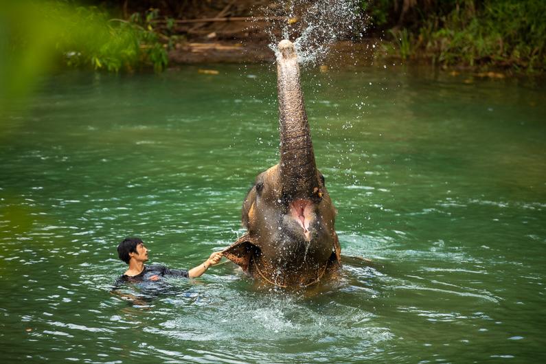 The herd of elephants In Khao Sok National Park consists of 14 elephants – all female – with an age range stretching from 14 to 76 years. The sanctuary includes a large area of land that allows for free roaming approximating that of a natural habitat. A new elephant is added to the herd only if: 1.) it fits the structure of the herd and 2.) there are enough funds to feed the elephant, its mahout and the mahout’s family.